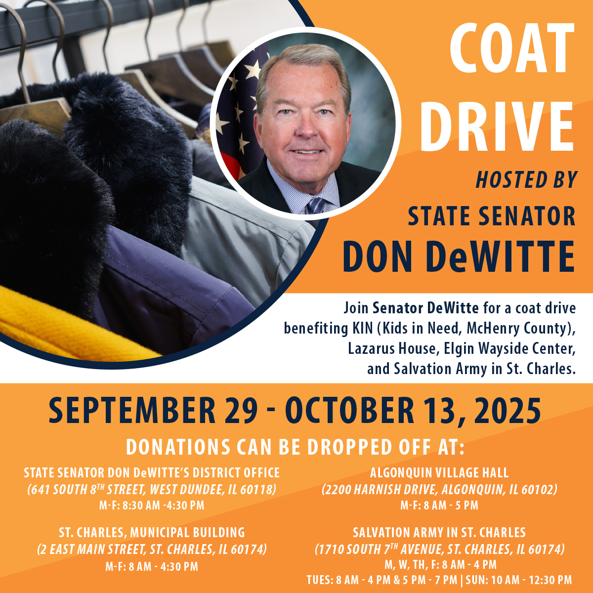 Event Senator Don DeWitte to Host 4th Annual New and Gently-Used Coat Drive To help ensure families in the 33rd District have warm coats this winter, State Senator Don DeWitte (R-St. Charles) is launching his 4th annual new September 19, 2025