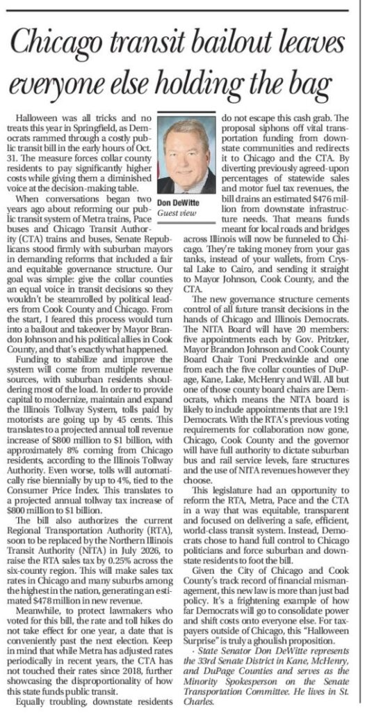 As mentioned last week, as the Minority Spokesperson for the Senate Transportation Committee, I was heavily involved for the last two years in discussions related to public transit reforms for the State of Illinois. When we set out to solve a looming fiscal cliff for Metra, Pace, and the CTA and to reform the transit governance structure to provide greater accountability, I held high hopes that we would be able to come together to create legislation that solved current and future financial issues while putting in place a governance structure that was equitable in oversight board membership and voting authority.